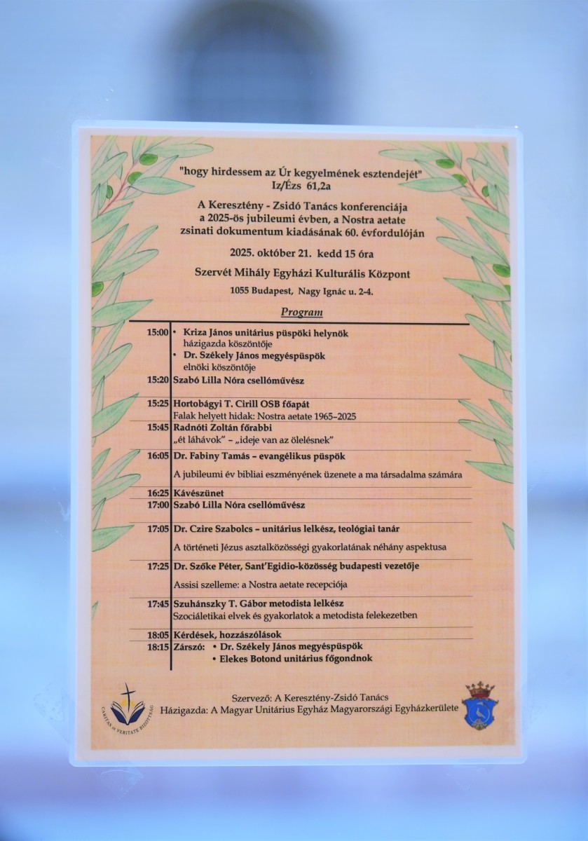 A Magyar Unitárius Egyház Magyarországi Egyházkerületének vezetői örömmel adtak otthont a Szervét Mihály Egyházi Kulturális Központban a Keresztény-Zsidó Tanács éves konferenciájának a 2025-ös jubileumi évben, a Nostra aetate zsinati dokumentum kiadásának 60. évfordulóján.